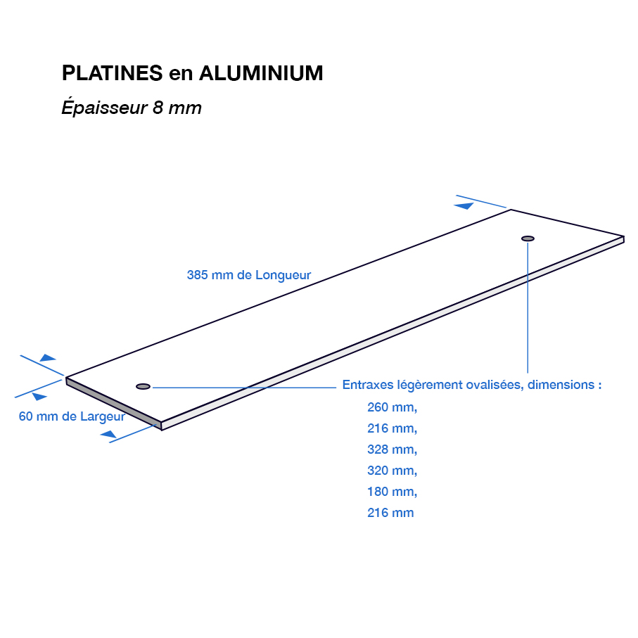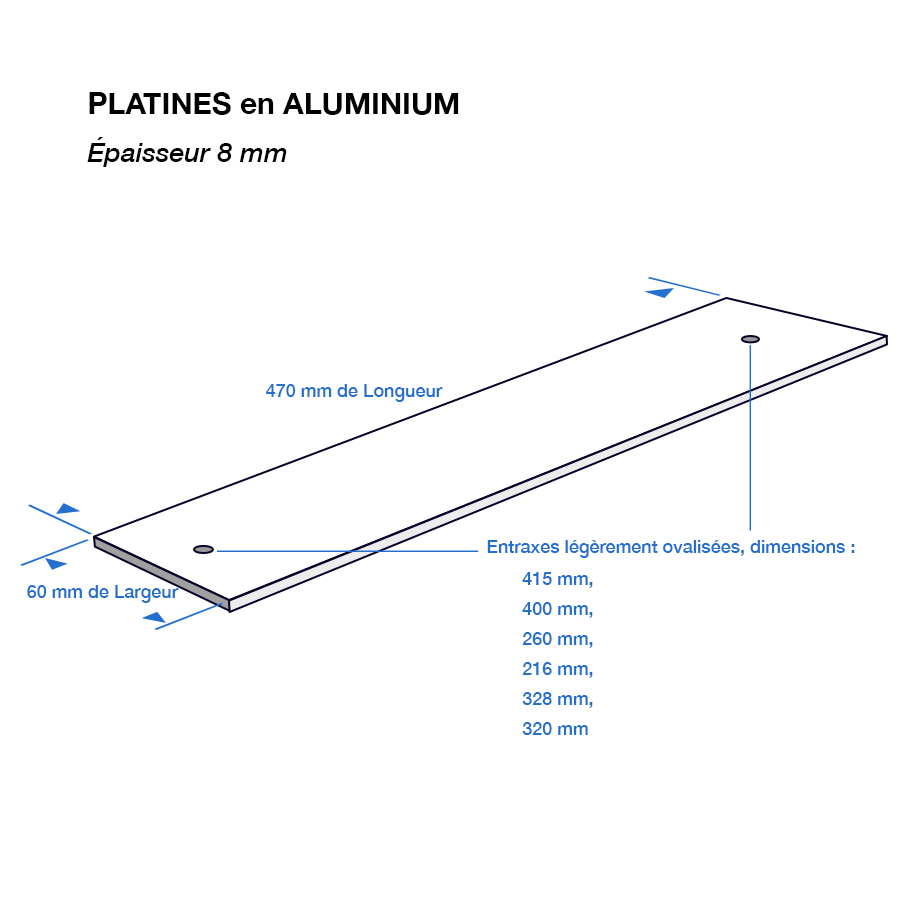 Platines d’adaptation en aluminium qui se pose entre les glissières du siège adaptable et sur les entraxes d’origine Trois platines disponibles : -En largeur de 60 millimètres/ -Longueur de 470 millimètres, -Longueur de 445 millimètres, -Longueur de 385 millimètres,